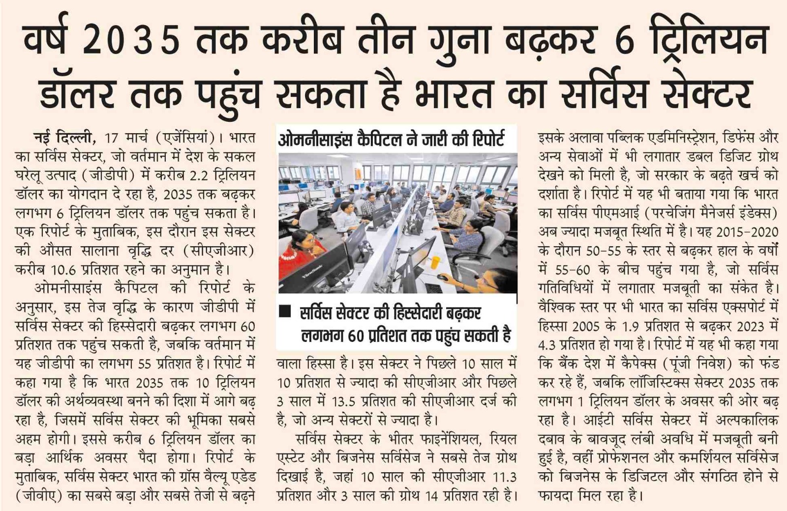 वर्ष 2035 तक करीब तीन गुना बढ़कर 6 ट्रिलियन डॉलर तक पहुंच सकता है भारत का सर्विस सेक्टर