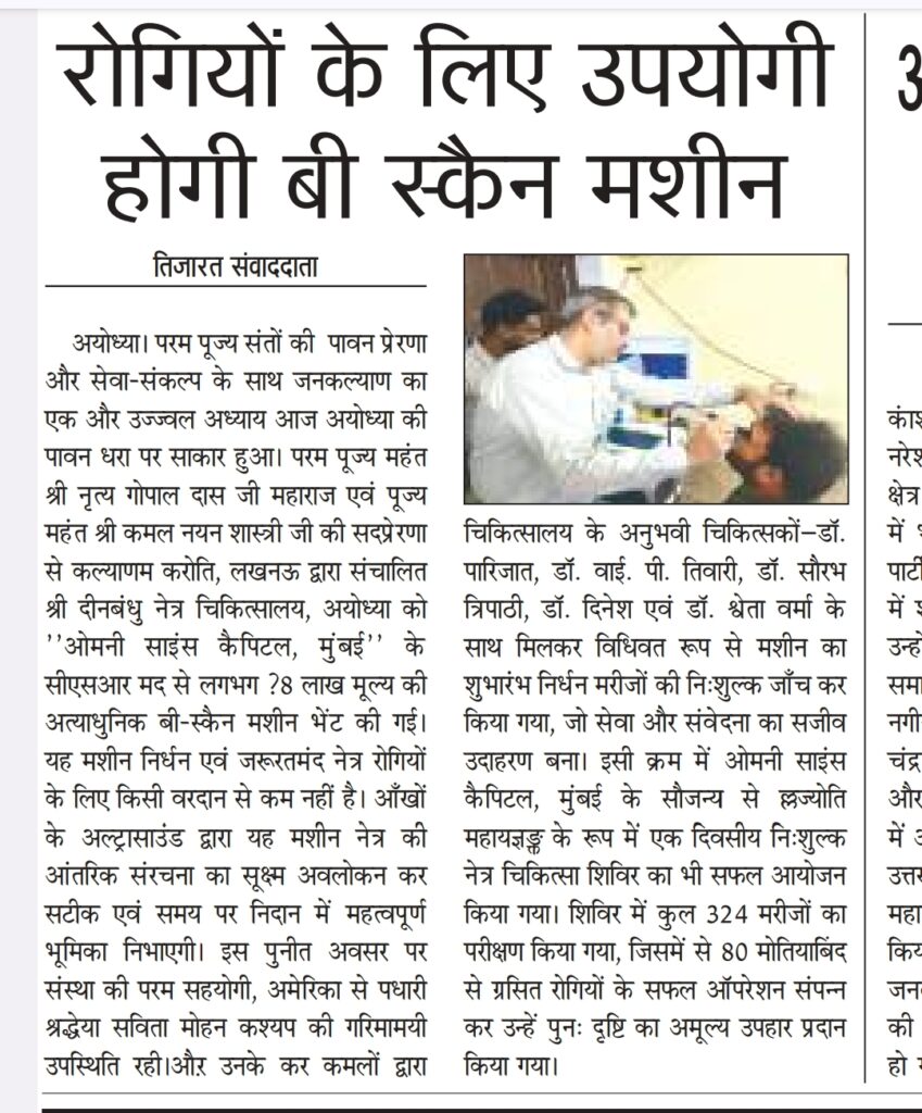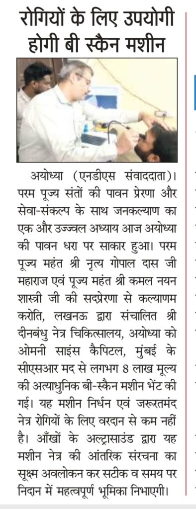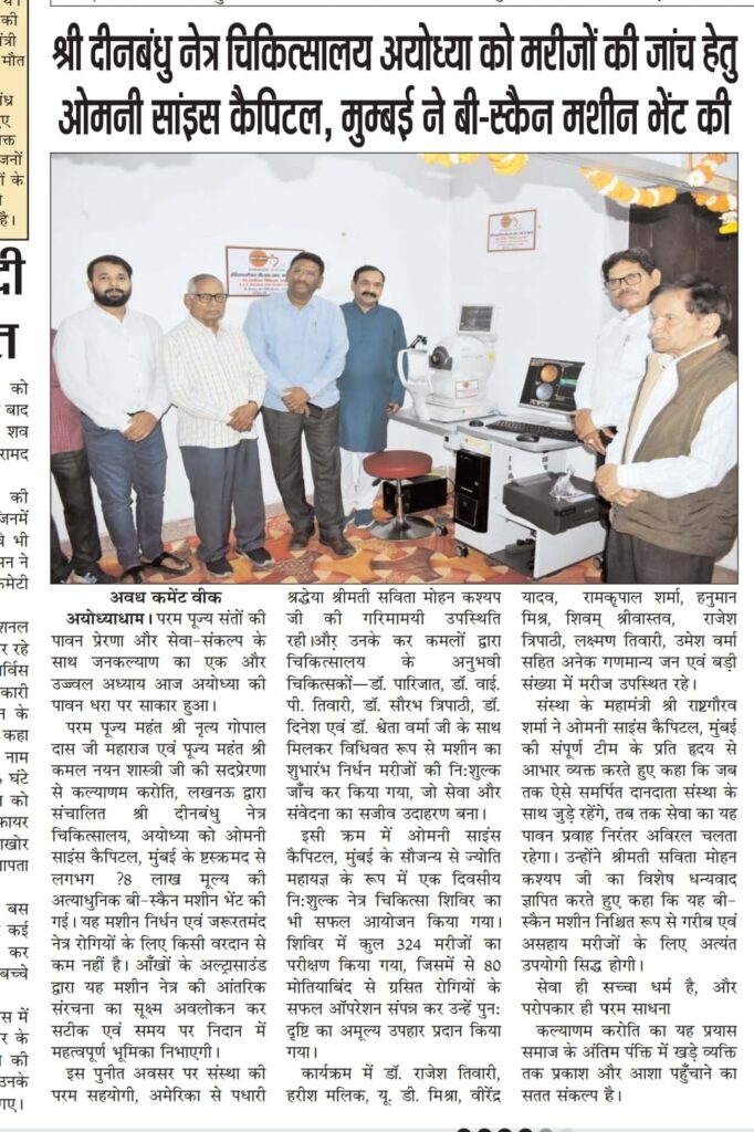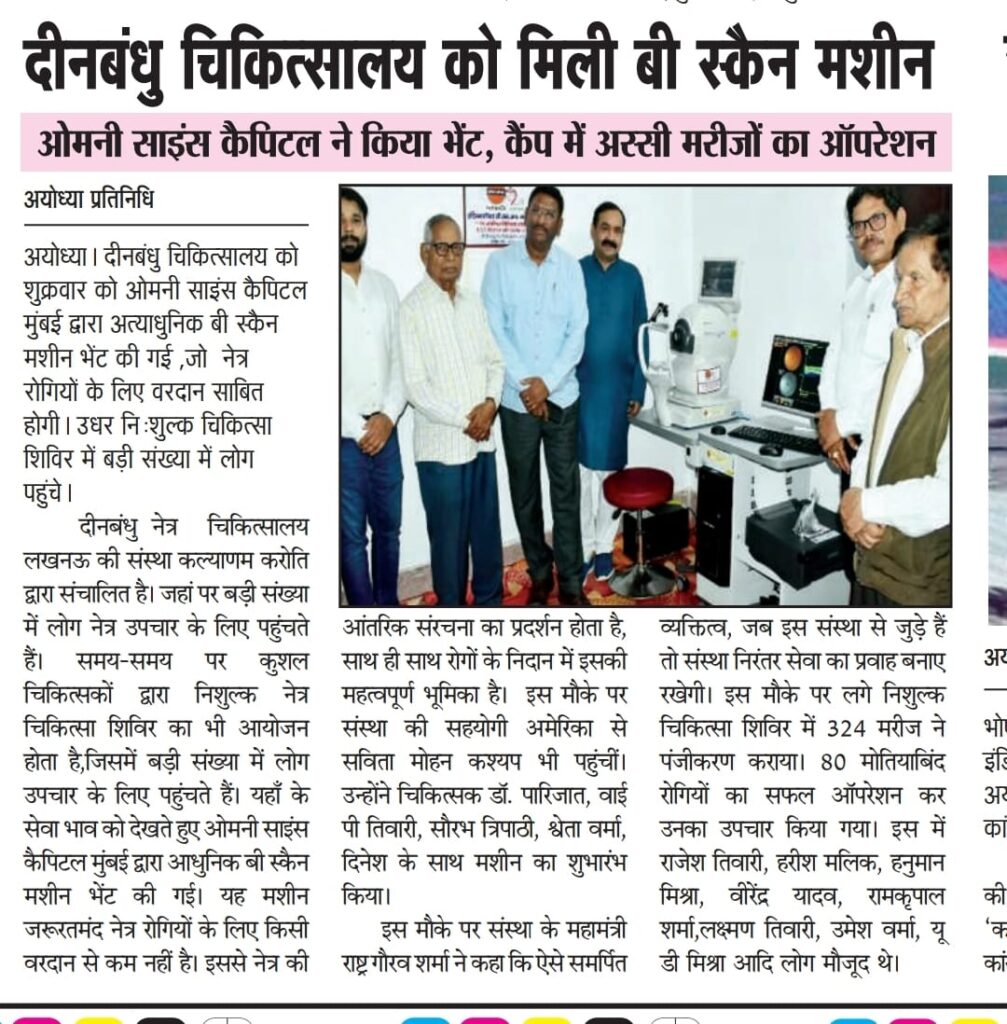 श्री दीनबंधु नेत्र चिकित्सालय अयोध्या को मरीजों की जांच हेतु ओमनी साइंस कैपिटल, मुंबई ने बी-स्कैन मशीन भेंट की